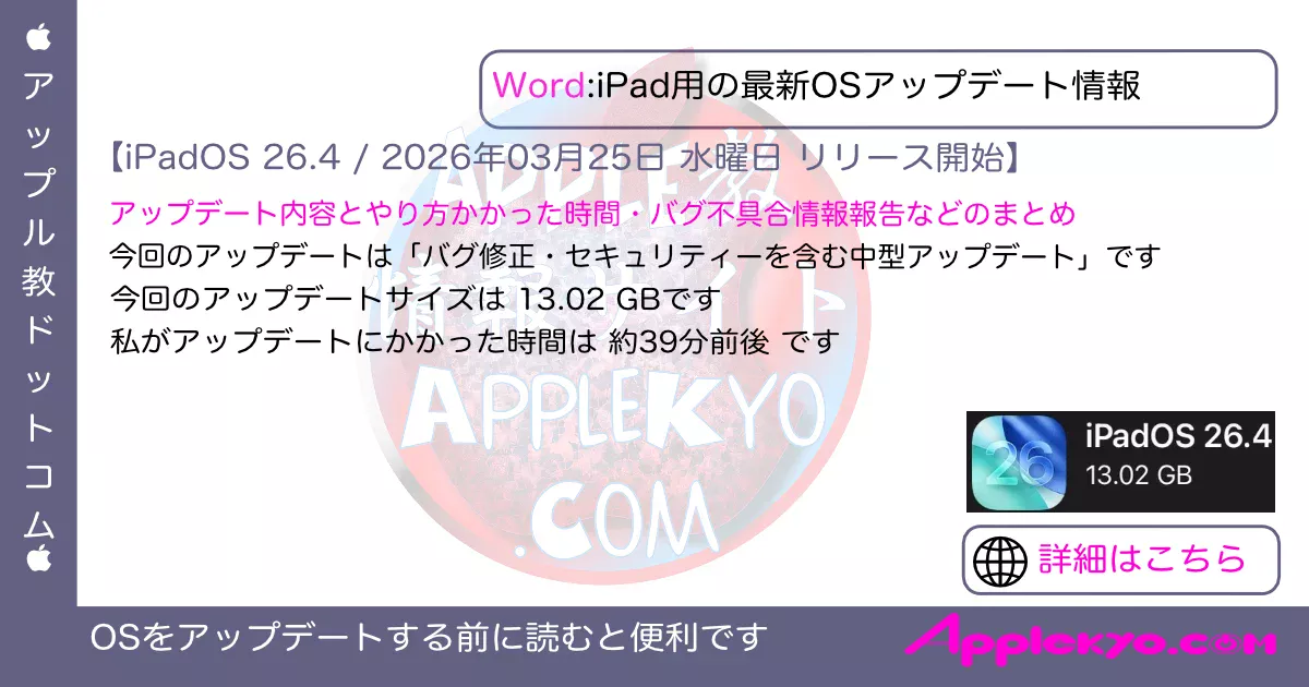 iPadOS 26.3.1 配信開始日は2026年03月05日 木曜日 (日本時間) iPadOS 26.3.1 記事のアップデート情報 2026年03月05日 木曜日 (日本時間) 記事公開 OSリリース情報 今回...OS情報:総合 -