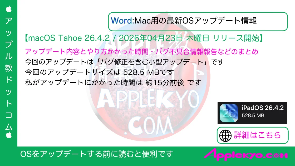 macOS Tahoe 26.4.1 配信開始日は2026年04月09日 木曜日 (日本時間) 記事のアップデート情報 2026年04月09日 木曜日 (日本時間) 記事公開 OSリリース情報 今回 2026年04...OS情報:総合 -