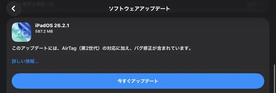 今回のOSと容量iPadOS 26.2.1【 587.2 MB 】