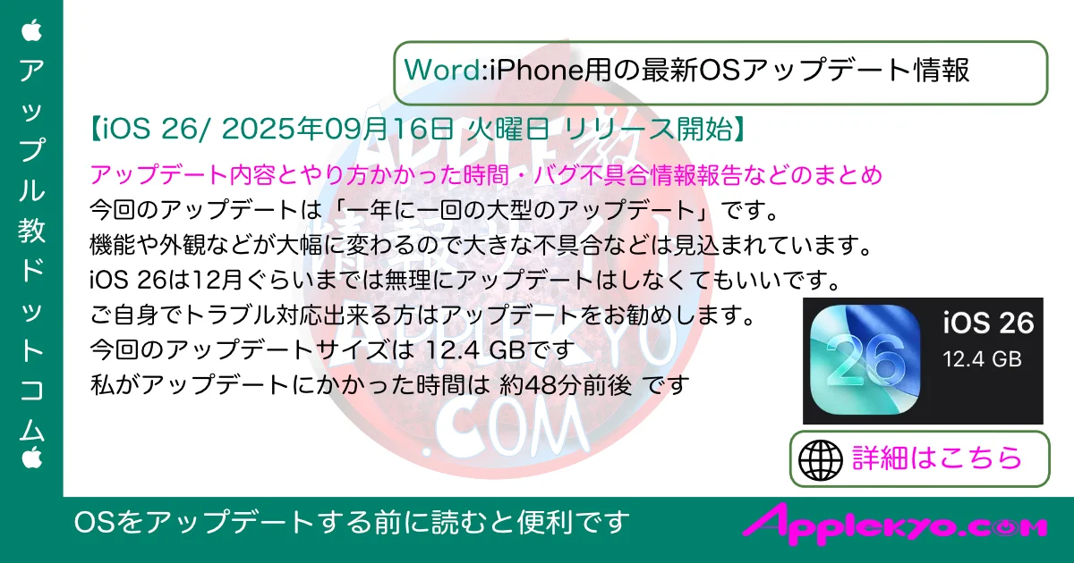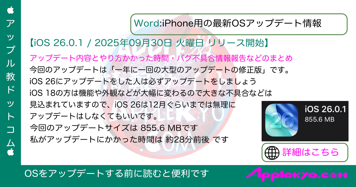 2025年09月30日 火曜日 (日本時間)にリリースされた「iOS 26.0.1」の情報はこちら