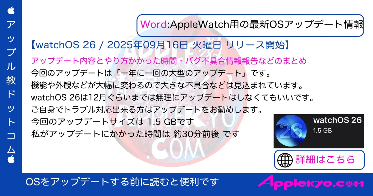 2025年09月30日 火曜日 (日本時間)にリリースされた「watchOS 26.0.2」の情報はこちら