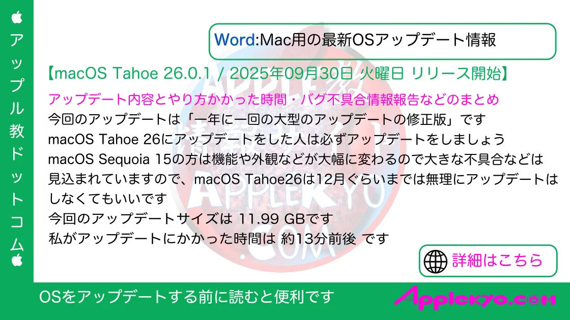 今回 2025年09月30日 火曜日 (日本時間)に最新OS macOS Tahoe 26.0.1 がリリースされました。