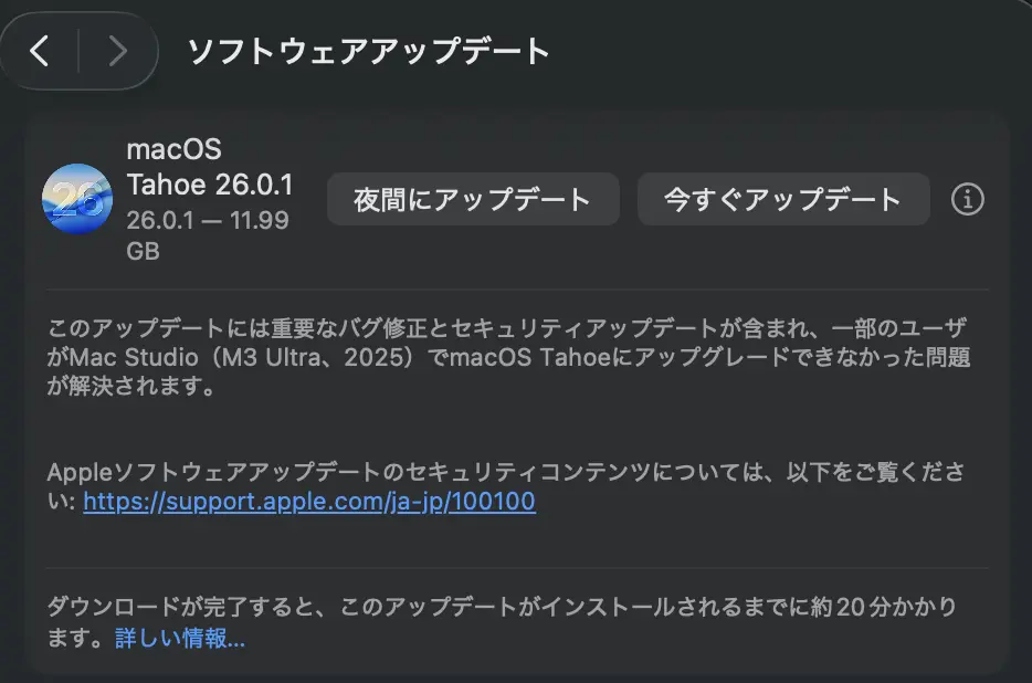 • このアップデートには重要なバグ修正とセキュリティアップデートが含まれ、一部のユーザがMac Studio(M3 Ultra、2025)でmacOS Tahoeにアップグレードできなかった問題が解決されます。